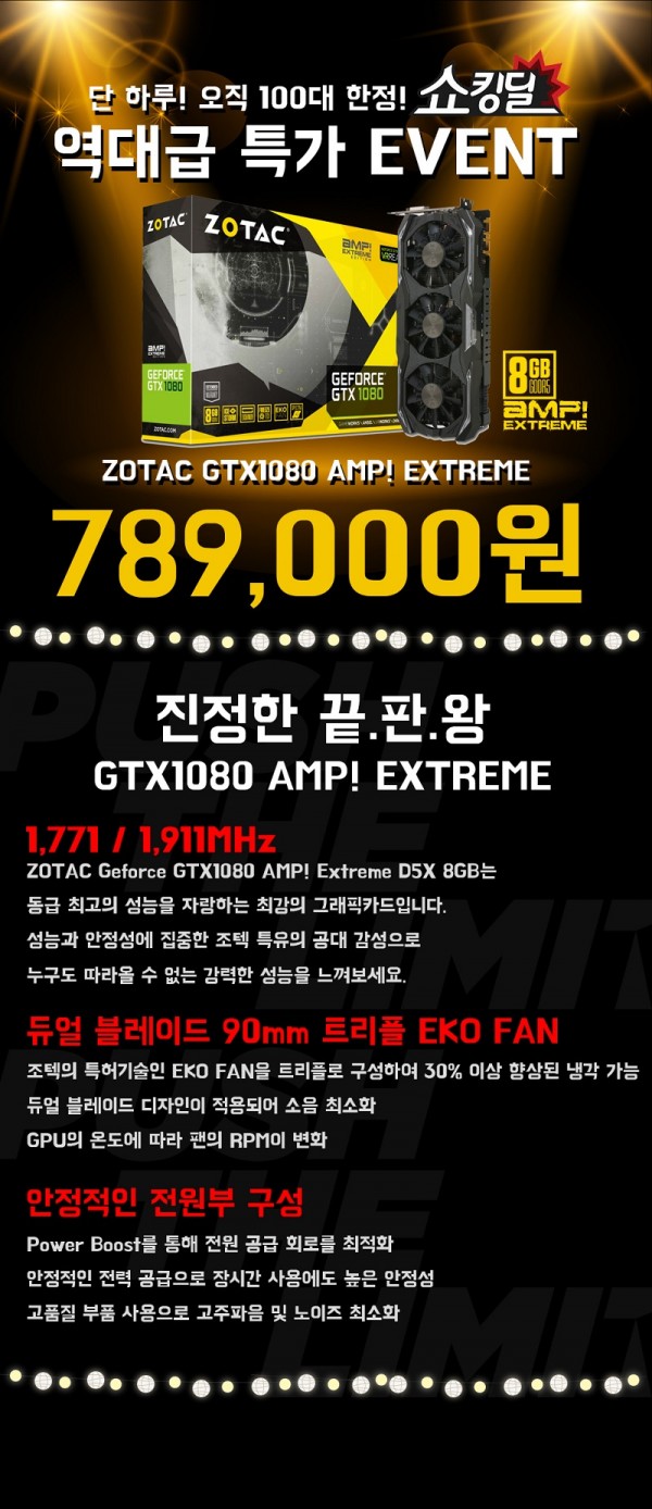 조텍코리아, 조텍, ZOTAC, ZOTAC Korea, 지포스 GTX1080 AMP! Extreme Edition D5X 8GB, 파격가, 11번가, 쇼킹딜 특가, 진행, 11번가 쇼킹딜 특가 이벤트, 100대, 한정 수량, 3월 3일, 금요일, 0시부터, 3월 3일, 23시 59분까지, 프로모션, 진행,
