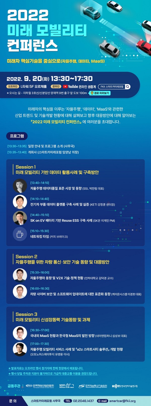 한국정보산업연합회, fkii, 스마트카미래포럼, smartcartech, 현대오토에버, 한국정보통신기술협회, TTA, 한국전자기술연구원, KETI, 2022 미래 모빌리티 컨퍼런스, 양재 엘타워, 온오프라인, 동시 개최