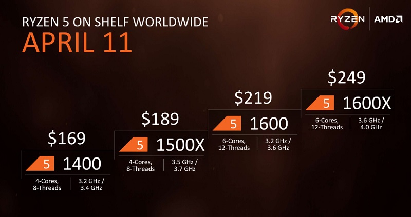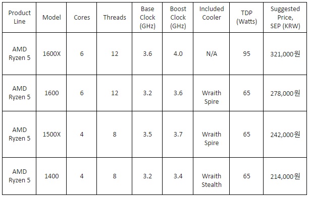 AMD, 라이젠 5, 라이젠 5 시리즈, Ryzen 5, 6코어 12스레드, 4코어 8스레드, 젠, Zen, 마이크로아키텍처, 1600X, 1600, 1500X, 1400, 4월 11일, 공식 출시,