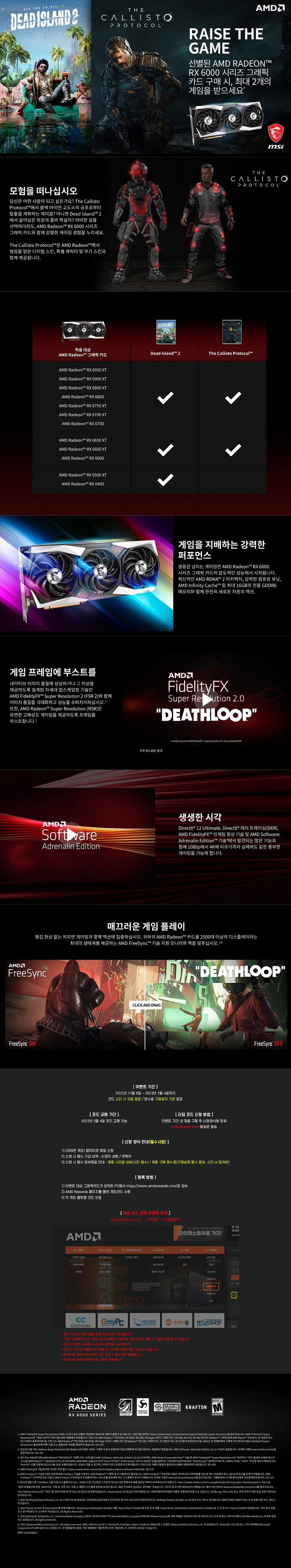 이벤트 기간은 2022년 11월 8일부터 2023년 2월 4일까지 구매자를 대상으로 하며 ‘MSI 라데온 RX 6950 XT / RX 6900 XT / RX 6800 XT / RX 6800 / RX 6750 XT / RX 6700 XT / RX 6700 / RX 6650 XT / RX 6600 XT / RX 6600 시리즈’ 그래픽카드를 구매하는 고객은 ‘데드 아일랜드2’와 ‘칼리스토 프로토콜’을 모두 받을 수 있으며 ‘MSI 라데온 RX 6500 XT / RX 6400 시리즈’ 그래픽카드를 구매하는 고객은 ‘데드 아일랜드2’를 받을 수 있다. 이벤트 신청 후 받은 코드는 ‘AMD Rewards’ 페이지를 통해 게임으로 교환할 수 있다.