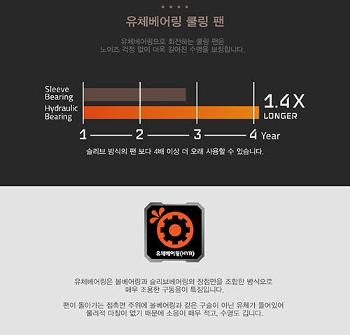극한의 동작 중 제품 내부에서 발생하는 열을 냉각하기 위해 지름 120mm의 유체베어링 팬(Hydraulic Bearing Fan)을 탑재해 슬리브 방식 보다 더 낮은 소음과 길어진 수명으로 PC 시스템의 안정성을 보장한다.