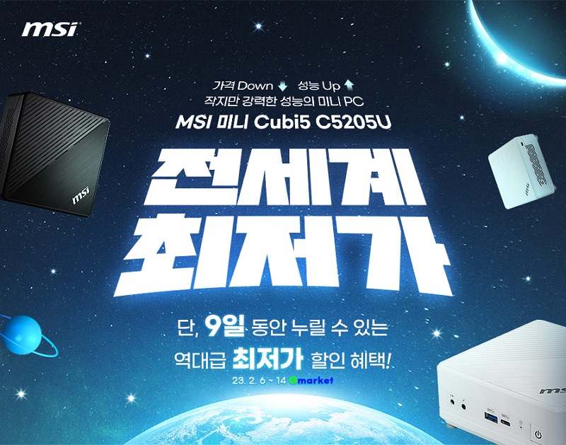 2023년 2월 6일부터 14일까지, 총 9일간 진행되는 이번 행사는 디지털/가전 카테고리 대상으로 진행되며, MSI 미니PC는 누구나 받을 수 있는 15% 선택쿠폰과 5% 카드할인을 추가해 최대 20% 할인 혜택을 제공한다.