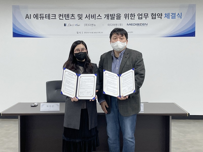 코스닥 상장사 미디어젠(279600, 대표 고훈)은 교육 컨설팅 및 10여 년간 공공 영어 도서관을 운영해 온 다앤뉴(대표 박지선)와 인공지능(AI) 에듀테크 및 키오스크 사업을 위한 제휴를 맺었다고 밝혔다.