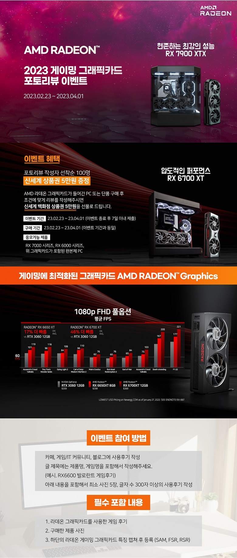 이번 포토후기 이벤트는 2023년 2월 23일부터 AMD 라데온 그래픽 카드를 구매한 고객을 대상으로 한다. 구입한 AMD 라데온 그래픽 카드 제품 사진 및 특장점 이미지가 포함된 사용 후기를 카페, IT/게임 커뮤니티, 블로그 등에 등록한 후 라이젠 커뮤니티(https://ryzen.co.kr/amd_event_form/write)에서 응모하면 추첨을 통해 선착순 100명에게 5만 원 상당의 신세계상품권을 제공한다. 본 이벤트는 4월 1일까지 진행되며, 준비된 상품권 소진 시 조기 종료될 수 있다.