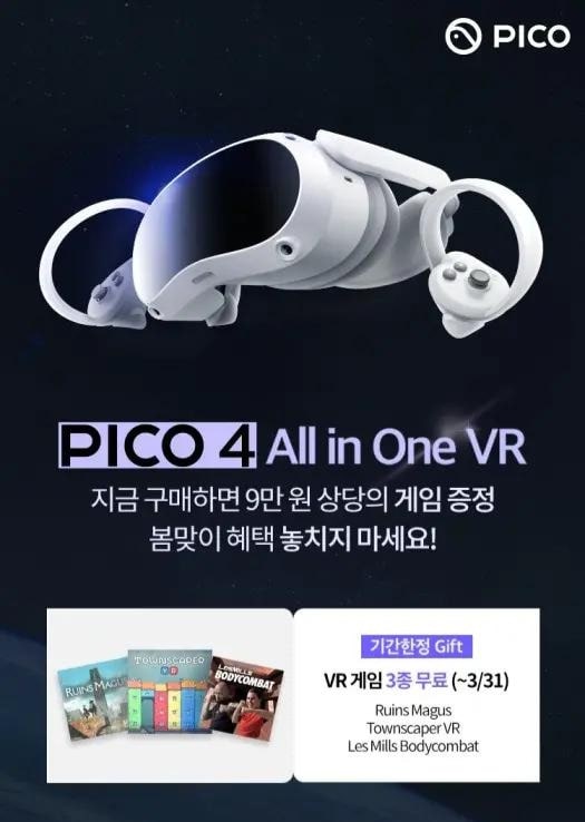 이번 이벤트는 온·오프라인 판매 채널에서 선착순으로 진행되는 프로모션이다. 온라인 판매 채널을 통해 PICO 4를 구매하는 고객은 ‘Les Mills BODYCOMBAT’, ‘Townscaper VR’, ‘Ruins Magus’ 게임을, 오프라인 채널을 통해 구매하는 모든 고객은 보너스 혜택도 받아볼 수 있다.
