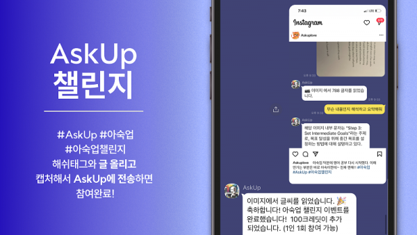 ‘AskUp 챌린지’는 누구나 인증 사진을 찍어 AskUp에게 보여주기만 하면 크레딧 선물을 받을 수 있는 이벤트로 참여 방법은 간단하다. 생활 속에서 AskUp의 다양한 활용방법을 #AskUp #아숙업 #아숙업챌린지 등 3개 해시태그를 달아서 본인의 SNS에 공유하고, 이를 AskUp에 사진을 보내기만 하면 된다.