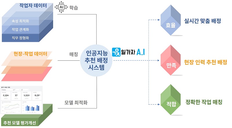 일가자가 이번에 출시한 인공지능 기반 작업-인력 맞춤 추천 배정 서비스는 운영 효율화, 24시간 맞춤 인력 배정을 위한 비용 절감, 매칭 정확도 개선을 통한 최적의 인력 배정과 실시간 맞춤 일자리 지원을 목적으로 구현됐다.