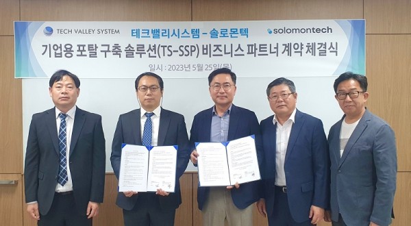 솔로몬텍(대표 홍지수)이 5월 25일 테크밸리시스템(대표 장석원)과 업무 협약식을 통해 기업용 포털 구축 솔루션 ‘TS-SSP’의 공동 저작권 등록을 마쳤다고 밝혔다. 이번 협약식을 통해 솔로몬텍은 양 사 간 적극적인 사업 협력을 통해 기업용 포털 시장 점유율을 본격적으로 확대할 예정이다.