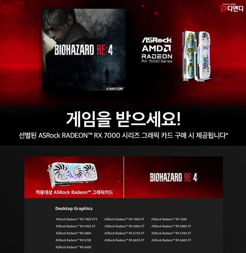 디앤디, 디앤디컴, dnd, dndcom, 애즈락, 에즈락, ASRock, AMD, 라데온 RX 7000 시리즈, 라데온 RX 6000 시리즈, 그래픽카드, 구매, 바이오하자드 RE:4, Biohazard RE:4, 레지던트 이블 RE:4, Resident Evil RE:4, 증정, 게임 번들, 프로모션, 진행