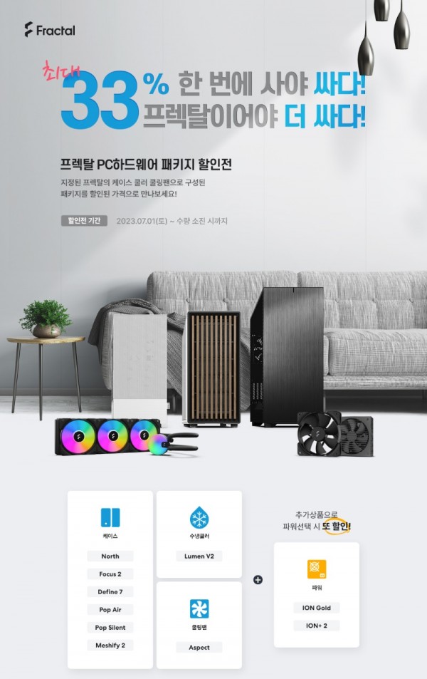 프렉탈디자인의 이번 패키지 할인 판매는 메쉬파이(Meshify) 2 시리즈와 디파인(DEFINE) 7 시리즈, 팝(POP) 시리즈, 포커스(Focus) 2 시리즈, 노스(North) 시리즈와 같은 PC케이스 제품을 기반으로 일체형 수냉 쿨러 제품인 루멘(Lumen) V2 시리즈와 애스펙트(Aspect) 12 RGB PWM 제품을 하나로 묶어 최대 33% 할인된 가격이 책정되었다. 여기에 더해 아이온(ION) 플러스 2 플래티넘과 아이온 골드 파워서플라이 제품을 추가 상품으로 구매할 경우 10% 이상의 할인율을 더 적용 받을 수 있다.