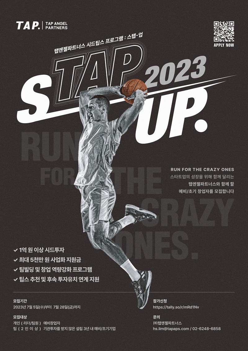 탭엔젤파트너스는 시드 팁스(Seed TIPS) 배치 프로그램 ‘STAP UP 2023’의 참여 기업을 7월 28일까지 모집한다고 밝혔다. 탭엔젤파트너스는 2022년 팁스 운영사, 2023년 시드 팁스 운영사로 선정됐다.