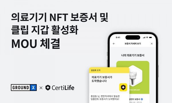 의료기기 보증서 플랫폼 스타트업 서티라이프가 7월 10일 카카오 블록체인 기술 계열사 그라운드엑스와 NFT 의료기기 보증서 확대 및 디지털 자산 지갑 ‘클립’의 활성화를 위한 업무협약(MOU)을 체결했다고 밝혔다.
