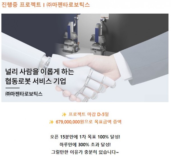 마젠타로보틱스(대표 임영태, 권기현)가 100억 규모의 정부 사업 수주를 기반으로 펀딩포유를 통해 2차 크라우드 펀딩을 성황리에 진행하고 있다고 밝혔다.