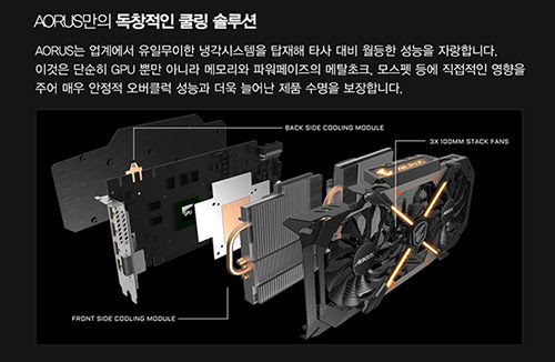이것은 광폭의 구리페널과 방열판이 GPU, RAM, MOSFET, 메탈초크에 직접 닿아 강력한 퍼포먼스 중에 발생할 수 있는 발열을 획기적으로 냉각시킬 수 있는 완벽에 가까운 솔루션이며, 그 동안 누구도 선보이지 못한 구리백플레이트를 탑재해 동작 중 발생하는 열을 PC케이스의 후면 팬을 이용해 밖으로 배출할 수 있도록 하는 혁신적인 구조이다.