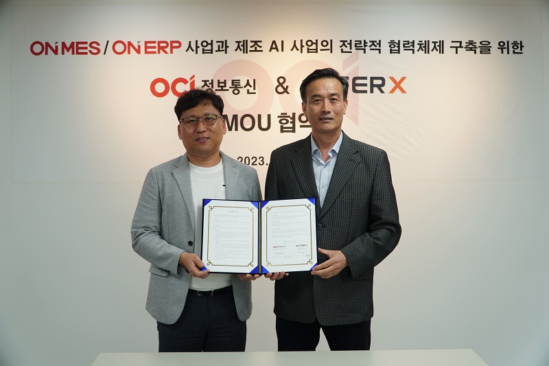 제조 인공지능(AI) 및 자율공장 전문기업 인터엑스(INTERX, 대표 박정윤)는 경영혁신 솔루션 제공 기업 OCI정보통신(대표 김광호)과 OCI정보통신 본사에서 제조 AI 공동 솔루션 개발 협력을 위한 업무협약(MOU)을 체결했다.