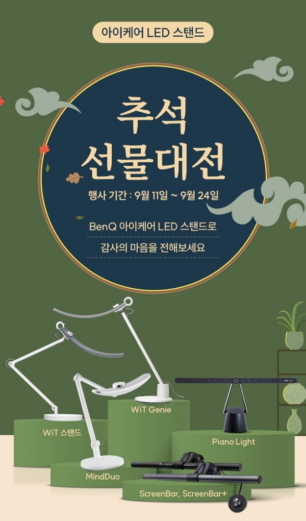 다가오는 민족 대명절 추석을 맞이하여, 9월 11일부터 9월 24일까지 14일간 벤큐샵과 벤큐 공식 네이버 브랜드 스토어에서 아이케어 LED 스탠드 추석 선물대전 행사를 진행한다. 행사 기간 동안 아이케어 LED 스탠드 전 제품 10% 할인을 기본으로 다양한 추가 이벤트가 진행된다.
