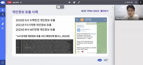 세 번째 세션의 연사로 나선 LG전자 송효진 책임연구원은 ‘아이덴티티’, ‘크리덴셜’, ‘월렛’ 세 가지 핵심 키워드를 통해 디지털 전환에 대한 기술적 고려사항과 웹 표준 방향성에 대한 인사이트를 전달했다. 마지막은 삼성전자 인터넷 브라우저 PM 임동우 수석 연구원의 세션으로 TPAC 2023에서 삼성 폴더블 기기에 맞춘 Device Posture API 표준화와 보안 기능에 대한 강연을 진행했다.