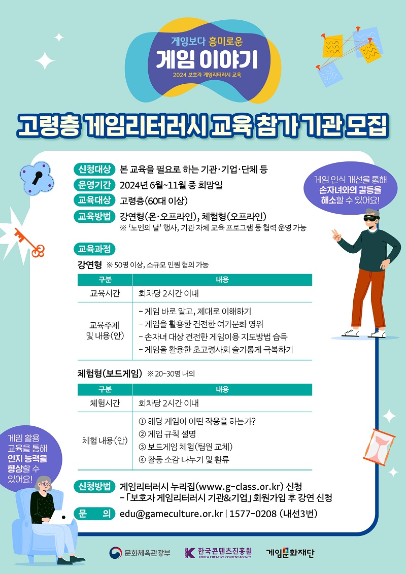 게임문화재단(이사장 김경일, 이하 재단)은 문화체육관광부(장관 유인촌), 한국콘텐츠진흥원(원장 조현래)과 함께 오는 7월 29일까지 ‘2024 보호자 게임리터러시 교육’ 참가 기관을 모집한다고 밝혔다.