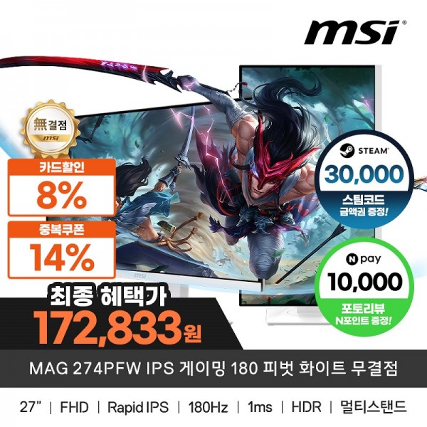 순백의 화이트 컬러 감성으로 모니터 성능을 넘어 디자인 및 인테리어의 역할을 담당하는 27인치 ‘MSI MAG 274PFW’ 역시 행사에 포함되어 관심이 주목되고 있다.