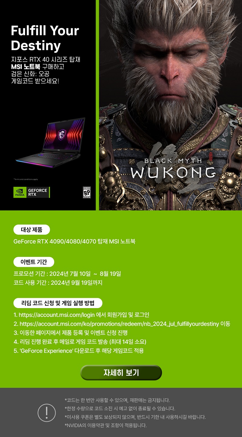 (주)엠에스아이코리아, 엠에스아이, MSI, MSI Kroea, 고성능, 노트북, 검은 신화: 오공, 게임 코드 증정