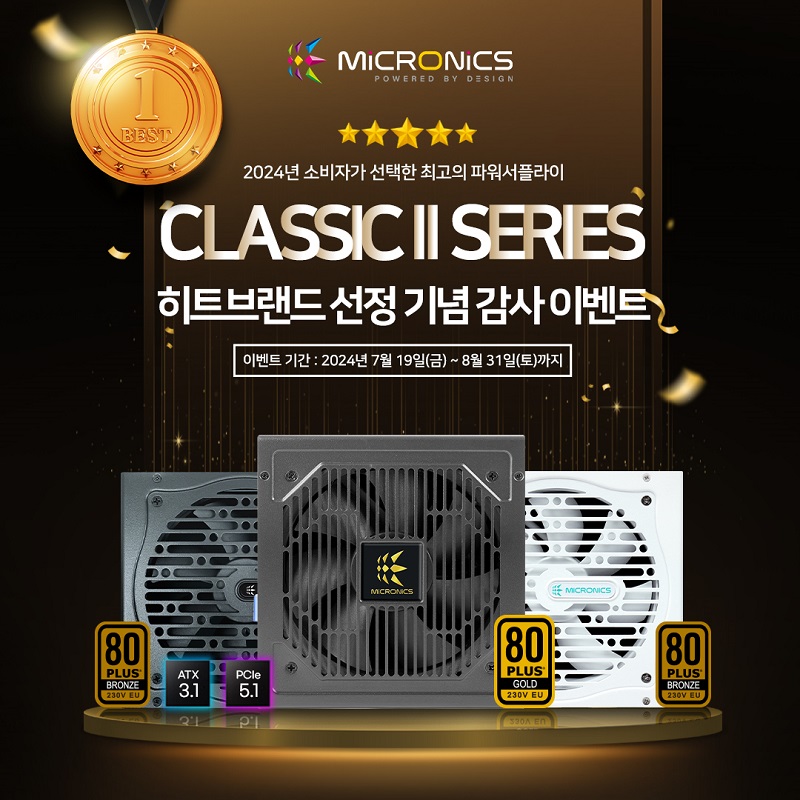 행사 대상 제품군은 마이크로닉스 클래식 II 풀체인지 ATX 3.1, 마이크로닉스 클래식 II 750/850W 80PLUS GOLD 풀모듈러 ATX 3.1, 마이크로닉스 CLASSIC II 1050W 80PLUS GOLD 풀모듈러(블랙/화이트)가 해당된다.