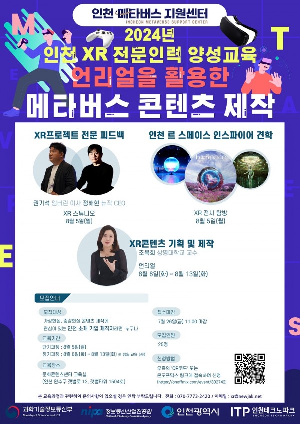 인천 테크노파크와 뉴작은 오는 8월 5일부터 13일까지 인천 소재 기업 재직자를 대상으로 ‘XR 전문인력 양성교육’ 교육생을 모집한다.