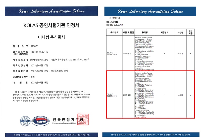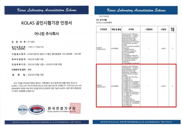 IT | 어니컴, 데이터 품질 분야 KOLAS 국제공인시험기관 인정 획득