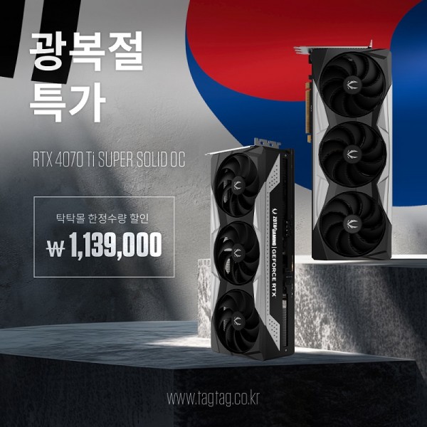 조텍의 ‘광복절 특가’ 프로모션은 조텍코리아 자사몰인 탁탁몰 (www.tagtag.co.kr)에서 단독 진행된다. 광복절을 맞아 진행되는 깜짝 특가 제품은 새롭게 출시된 ‘ZOTAC GAMING GeForce RTX 4070 Ti SUPER Solid OC’이다.