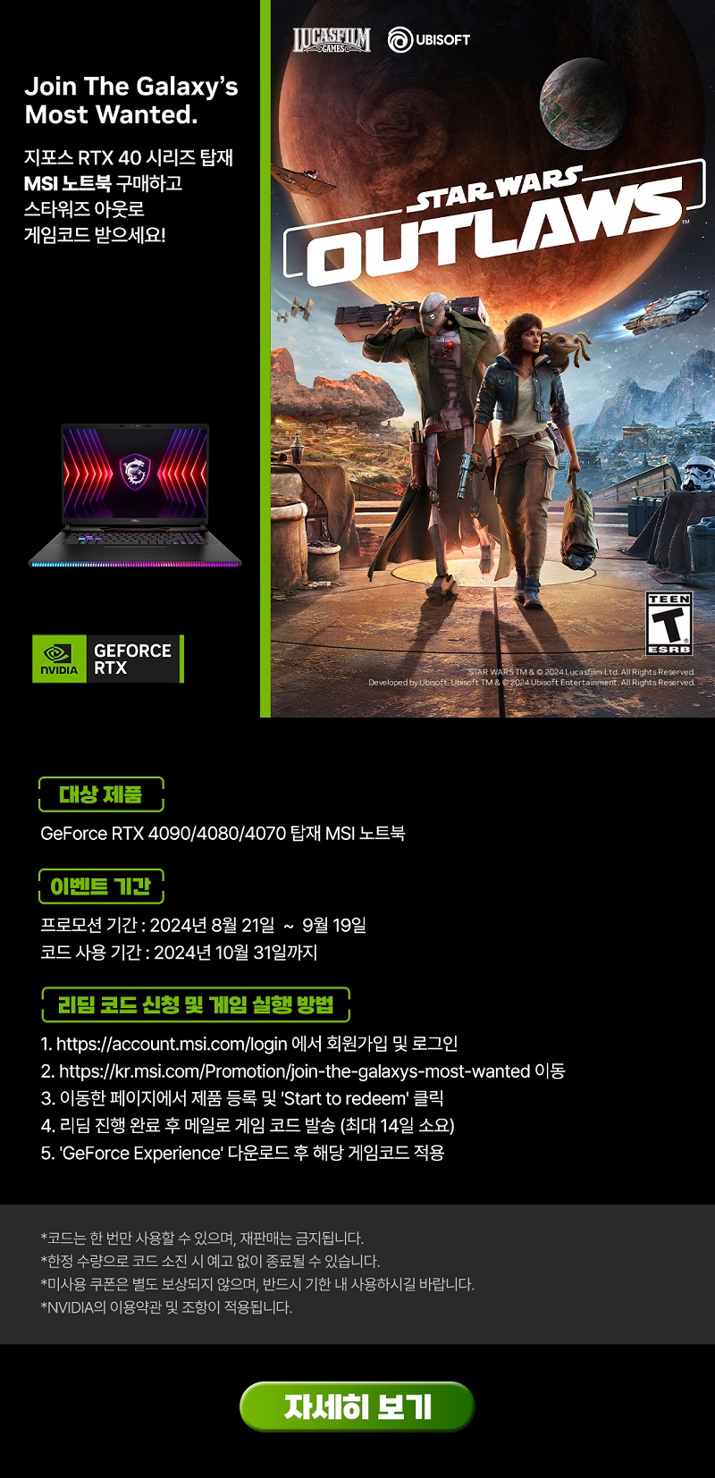 ㈜엠에스아이코리아(https://kr.msi.com, 대표 공번서)는 RTX 4090/80/70 시리즈 그래픽을 탑재한 MSI 노트북 구매 고객을 대상으로 스타워즈 아웃로(The Star Wars™ Outlaws) 게임 코드 증정 이벤트(https://kr.msi.com/Promotion/join-the-galaxys-most-wanted)를 진행한다고 밝혔다.