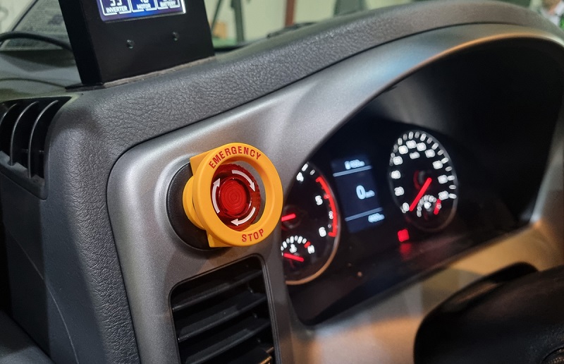 긴급정지 버튼은 운전석 좌측 상단에 위치한다. 원형의 빨간 버튼에 노란 색상의 가드가 감싸진 형태다. 이는 운전자가 긴급 상황에서 즉시 누를 수 있음과 동시에, 평소 운행 중 오작동하지 않도록 하기 위한 디자인이다. 버튼을 누른 후에는 간단한 재시동 절차를 통해 차량을 다시 운행할 수 있다. 또한 이 버튼은 설치 후 별도의 유지보수가 필요하지 않을 정도로 단순하면서도 신뢰할 수 있는 장치다.