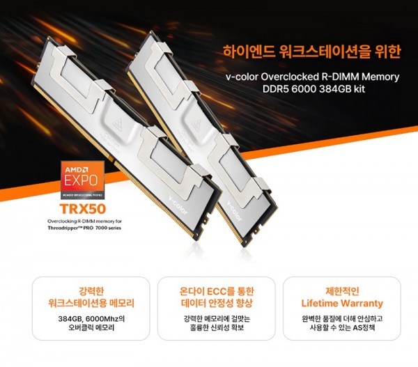 'V-Color DDR5-6000 EXPO CL34 ECC/REG 패키지'는 AMD Threadripper™PRO 7000 시리즈와 TRX50칩셋에 최적화된 오버클럭 워크스테이션 메모리로, 96GB 모듈 4개로 구성되어 있어 384GB라는 압도적인 RAM 용량을 사용자들에게 제공한다.