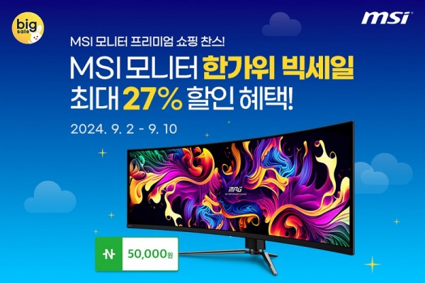 ㈜엠에스아이코리아(http://kr.msi.com, 대표 공번서)는 G마켓에서 진행하는 한가위 빅세일을 통해 인기 모니터 대상의 할인 프로모션을 진행한다.