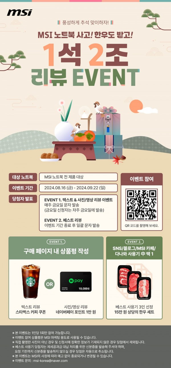 구매페이지에서 텍스트 리뷰를 작성하면 스타벅스 커피 쿠폰을, 사진/영상 리뷰를 작성하면 1만원 네이버페이 포인트 쿠폰을 전원 증정한다. 특히, SNS/블로그/MSI 카페/다나와 중 한 곳에 노트북 사용기를 작성하면, 베스트 리뷰어 3명을 선정하여 15만원 상당의 한우 세트를 증정한다.