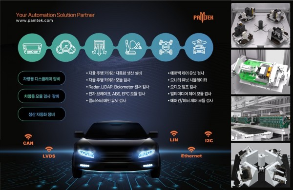 올해 새롭게 출시되는 자동차 컨트롤 네트워크의 통신 프로토콜(CAN, LIN, LVDS, I2C, Ethernet) 기술 기반의 차량 모듈 및 디스플레이 검사장치와 자동차 부품 제조/검사 관련 고객 맞춤형 자동화 솔루션 기술도 함께 홍보할 예정이다.