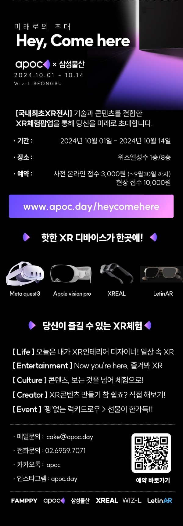 XR 콘텐츠 제작 및 공유 플랫폼 apoc을 개발한 스타트업 팜피 주식회사는 삼성물산과의 협력하에 2024년 10월 1일부터 14일까지 성수동 연무장길에 위치한 위즈엘 성수에서 ‘Hey, Come Here’ XR 체험전시를 개최한다.