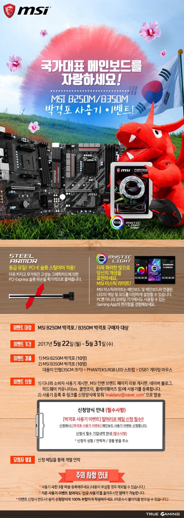 이벤트는 5월 22일(월)부터 5월 31일(수)까지 진행하며, B250M 박격포, B350M 박격포 두 제품을 사용하고 있는 메인보드 구매자를 대상으로 한다. 우수한 사용기를 작성한 사용자를 각 제품별로 10명(총 20명)씩 선정하여 MSI 마스코트 ‘용용이’ 인형(35CM 크기), MSI DSB1 게이밍 마우스, PHANTEKS RGB LED 스트립을 증정한다.