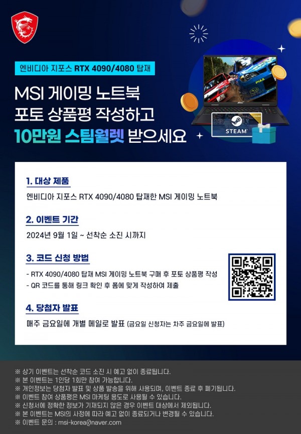 (주)엠에스아이코리아, 엠에스아이, MSI, MSI Korea, 10만 원, 스팀, 월렛, 증정!, 게이밍 노트북, 구매자, 이벤트, 진행