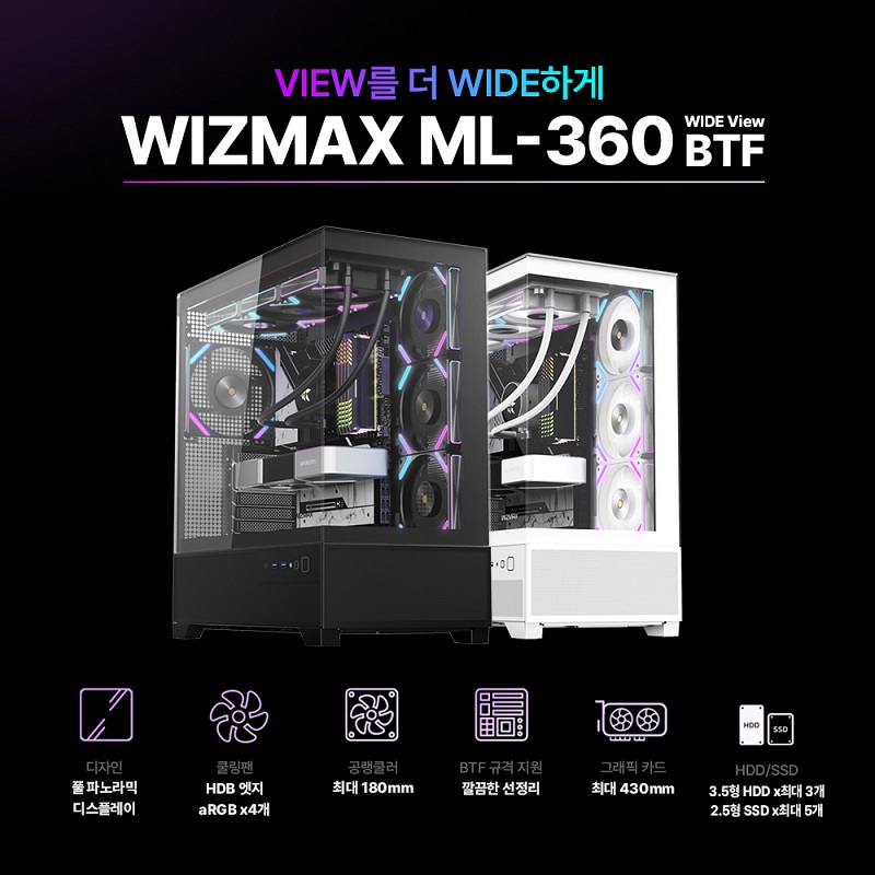 게이밍 기기 디자인·개발·제조 전문기업 한미마이크로닉스(대표: 강현민, 이하 마이크로닉스)는 풀 파노라믹 디스플레이에 자체개발 쿨링팬 탑재 및 BTF 메인보드를 지원하는 미들타워 PC 케이스 ‘WIZMAX ML-360 WIDE View BTF’(위즈맥스 ML-360 WIDE View BTF, 이하 ML-360 WIDE View BTF)의 행사를 진행한다.