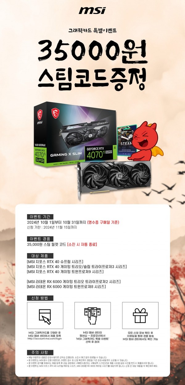 이번 행사는 2024년 10월 1일부터 10월 31일까지 이벤트 대상 그래픽카드를 구매하고 제품 등록을 마친 고객을 대상으로 진행된다. 기간 내 구매자들은 2024년 11월 15일까지 이벤트를 신청할 수 있다.
