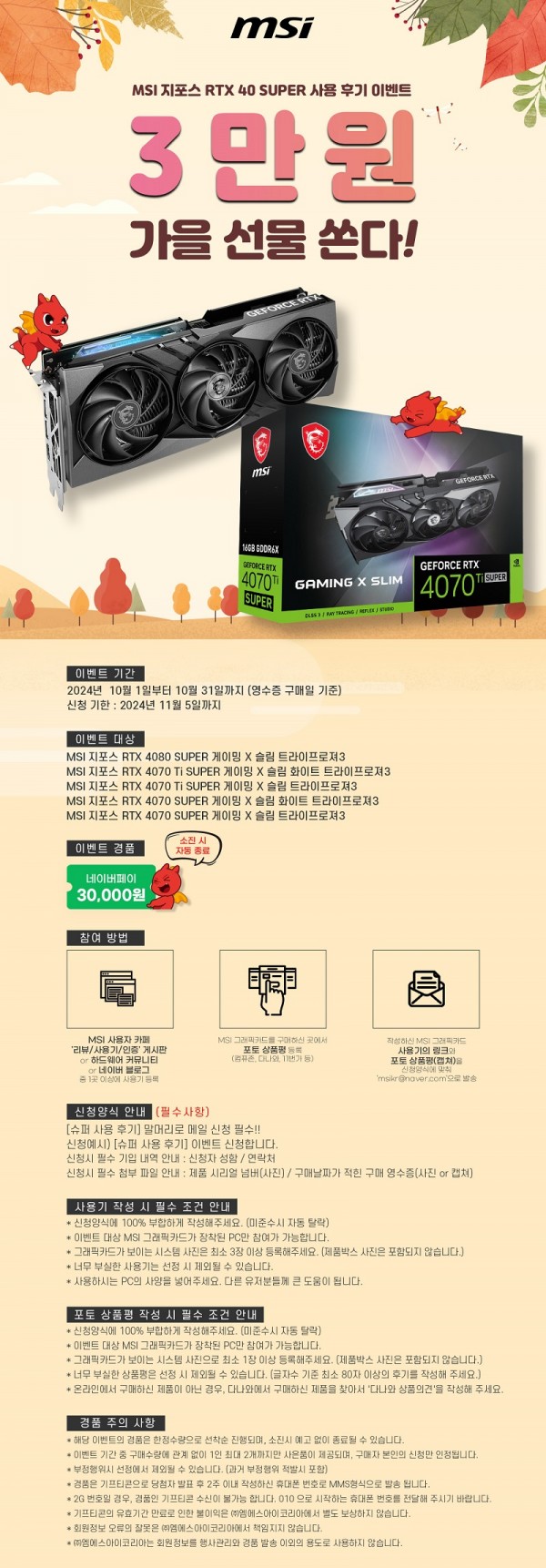 (주)엠에스아이코리아, 엠에스아이, MSI, MSI Korea, 3만원, 가을 선물, 받자!, 지포스 RTX 40 SUPER, 사용 후기, 이벤트, 진행