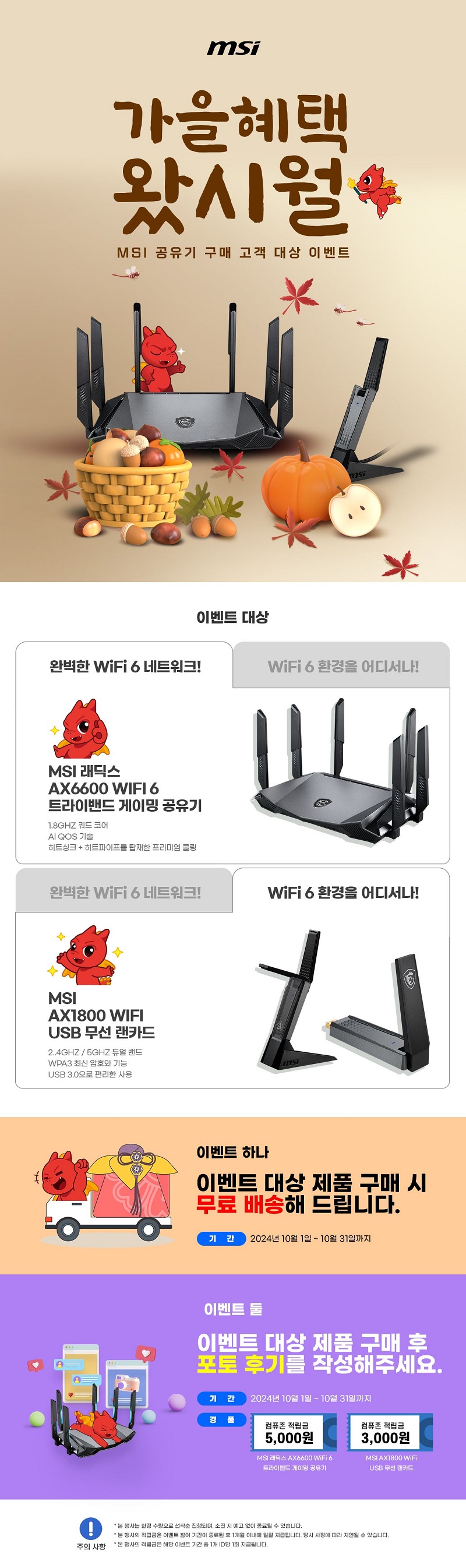 (주)엠에스아이코리아, 엠이스아이, MSI, MSI Korea, 무료, 배송, 적립금, 받자!, 공유기, 무선 랜카드, 이벤트, 진행