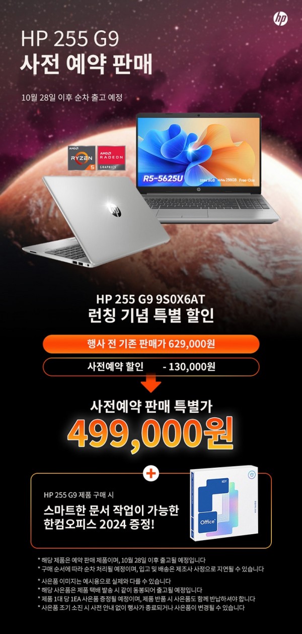 끝으로 라이프웍스는 HP 255 G9 제품 옥션/지마켓 사전예약 판매 프로모션을 통해 할인된 가격과 사전예약 판매 기간 동안만 스마트한 문서 작업이 가능한 한컴오피스 2024 를 증정할 예정이며, 10 월 28 일 이후 순차 출고될 예정이라고 전했다.