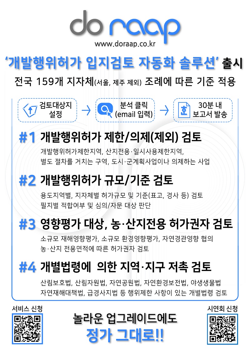 해당 솔루션은 알에이에이피 홈페이지(www.doraap.co.kr)에서 ‘두랍(do raap)’ 서비스 신청 시 즉시 이용이 가능하며, 시연회를 신청하면 서비스 전반적인 내용에 대한 설명회와 더불어 무료 테스트 이용도 가능하다. 두랍(do raap) 서비스 이용 시 개발행위허가 입지검토뿐 아니라 단지개발사업과 도시·군계획시설사업에 대한 공간분석 및 사업비 추정 서비스도 함께 이용할 수 있다.