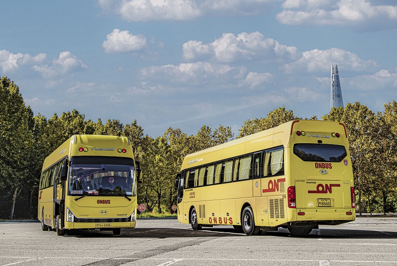 온버스는 ESG 경영 실천의 일환으로 수소전기버스를 적극 도입하고 있는 전세버스 기업으로, 현재도 국내 최다인 40여 대의 수소전기버스를 보유하고 있으며, 5년 내 2000여 대로 확대할 계획이다.