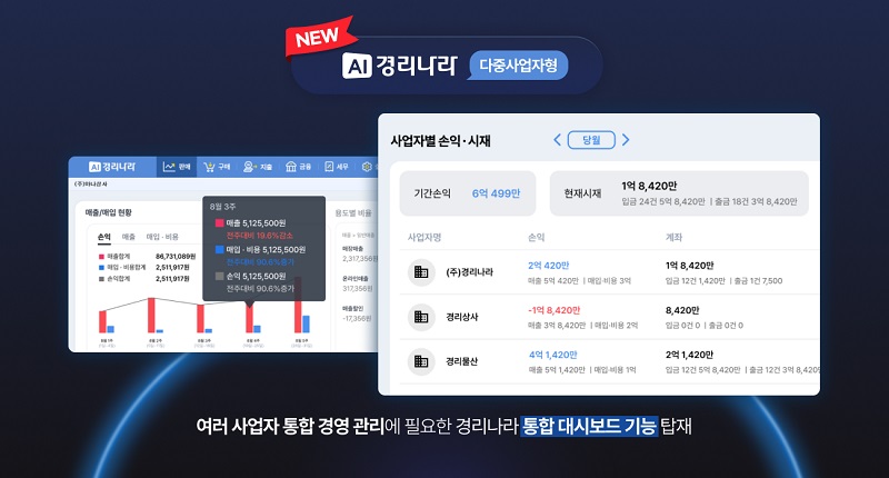 기존 AI경리나라가 중소기업의 경리업무 자동화에 중점을 뒀다면 이번에 출시한 AI경리나라 다중사업자형 상품은 여러 사업장을 운영하는 중소기업 사장님 및 관리자의 니즈를 반영해 사업장의 자금 흐름을 통합 관리할 수 있도록 기능이 확장된 점이 차별화된다.