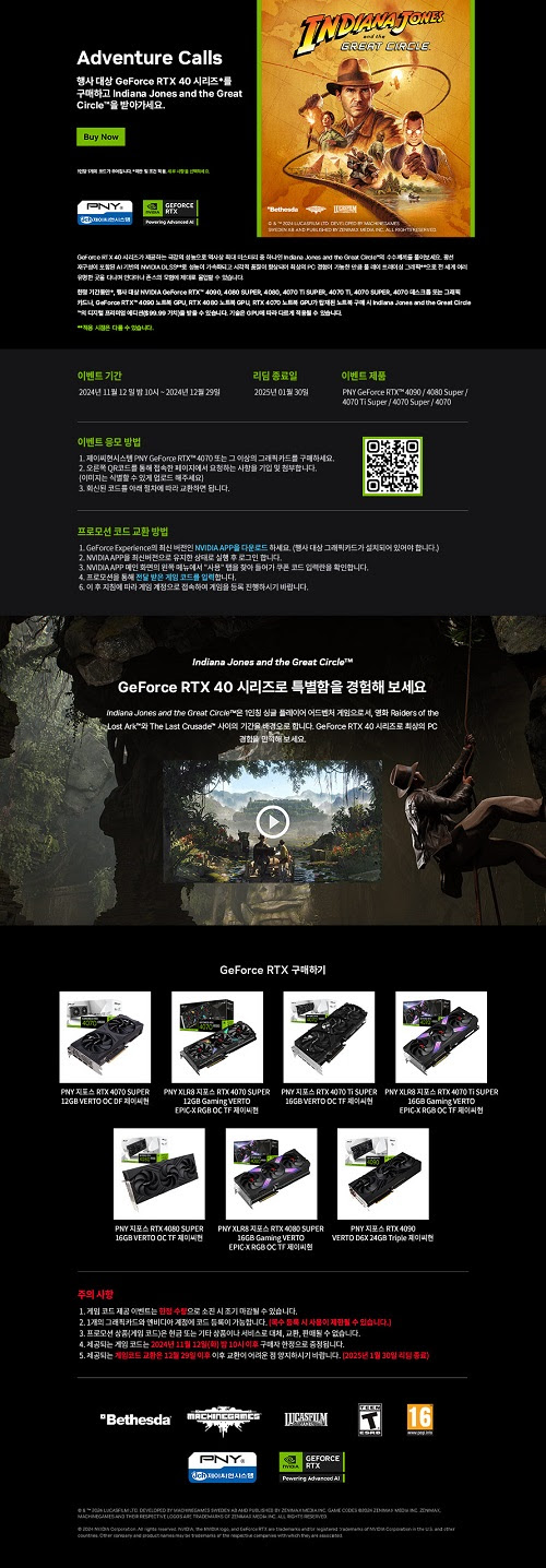 국내 PNY Technologies, Inc. 공식 공급원 제이씨현시스템㈜ (대표: 차중석, 차정헌)은 PNY GeForce RTX 4070 이상의 제품(RTX 4090, RTX 40 SUPER, RTX 4070) 구매 고객을 대상으로 Indiana Jones and the Great Circle 게임 코드를 증정하는 프로모션을 진행한다.