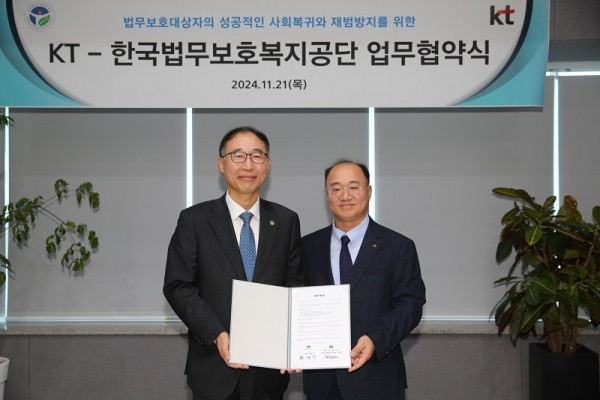 한국법무보호복지공단(이사장 황영기)과 KT 대구경북법인고객본부(본부장 서기홍)는 11월 21일(목) 대구광역시 북구 KT 북대구빌딩에서 보호대상자 지원사업 등을 위한 업무협약을 체결했다.