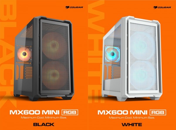 쿠거 MX600 미니 RGB는 동명의 PC케이스 모델인 MX600의 규격 파생 모델이다. 제품명인 ‘미니’에 맞춰 M-ATX 폼팩터의 메인보드를 지원하는 미니 타워 제품이며, 블랙과 화이트의 두 가지 색상으로 준비되어 있다.