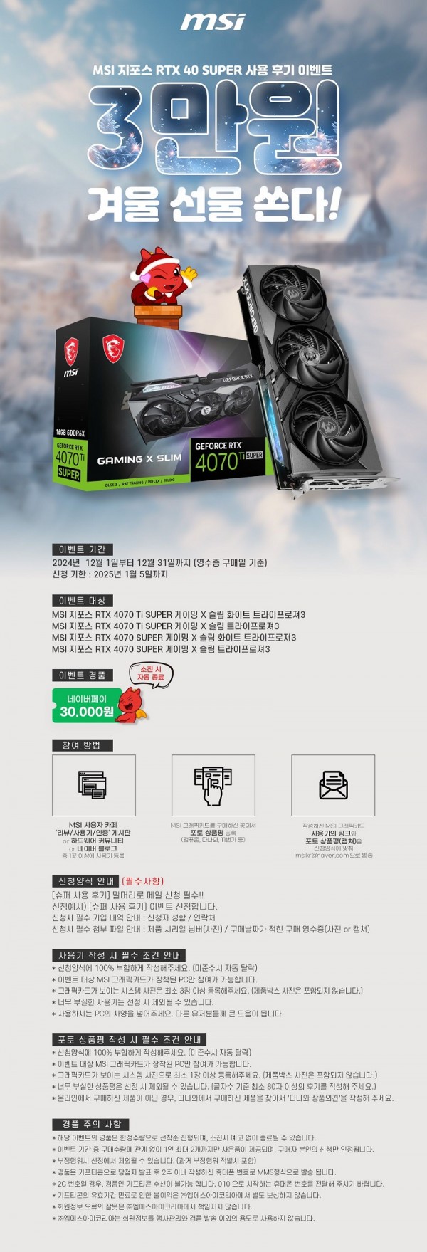 MSI, 지포스 RTX 40 SUPER 사용 후기 작성 시 네이버 페이 기프티콘 3만원 증정