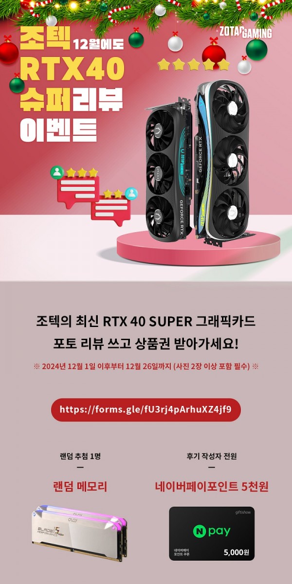 본 구매 후기 이벤트는 2024년 12월 1일 이후 구매부터 12월 26일 구매자까지 적용된다. 참여 방법은 간단하다. 구매한 ZOTAC GAIMNG GeForce RTX 40 SUPER 시리즈 그래픽카드의 장착 사진을 2장 이상 구매한 쇼핑몰에 리뷰와 함께 업로드하면 된다. 이후, 이벤트 신청 페이지를 통해 리뷰 링크와 정보를 제출하면 된다.